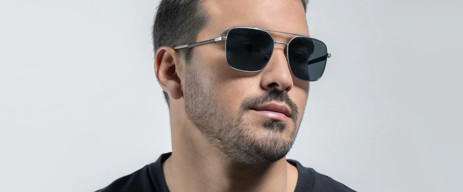 - Brushed nickel bold aviator style in stainless steel and wrapped leather frame material